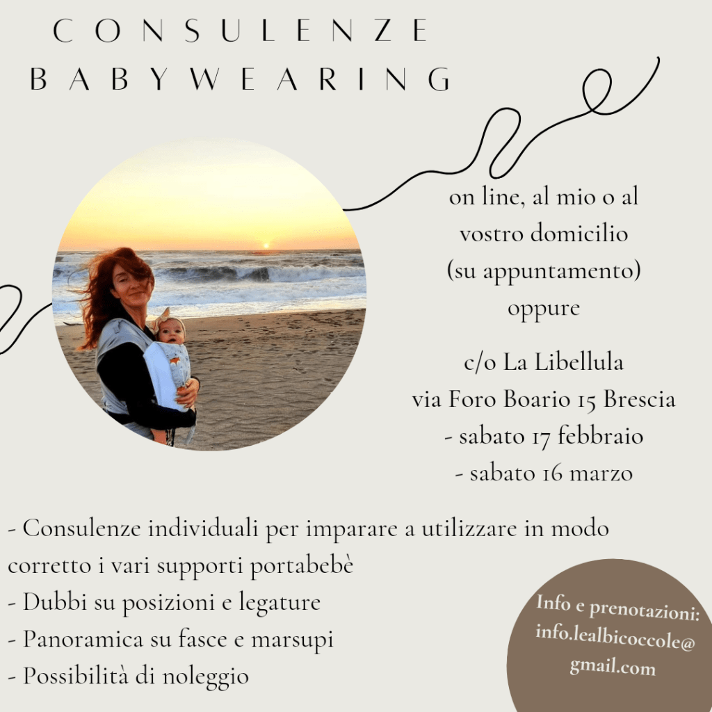 Durante le consulenze pratiche è possibile provare e imparare a utilizzare in modo corretto i vari supporti portabebè. Le consulenze si possono effettuare on line, a San Felice del Benaco, al vostro domicilio oppure presso La Libellula a Brescia.